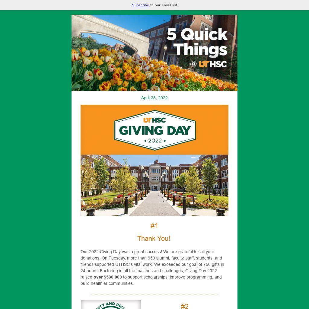 Our 2022 Giving Day was a great success! We are grateful for all your donations. On Tuesday, more than 950 alumni, faculty, staff, students, and friends supported UTHSC’s vital work. We exceeded our goal of 750 gifts in 24 hours. Factoring in all the matches and challenges, Giving Day 2022 raised over $530,000 to support scholarships, improve programming, and build healthier communities.