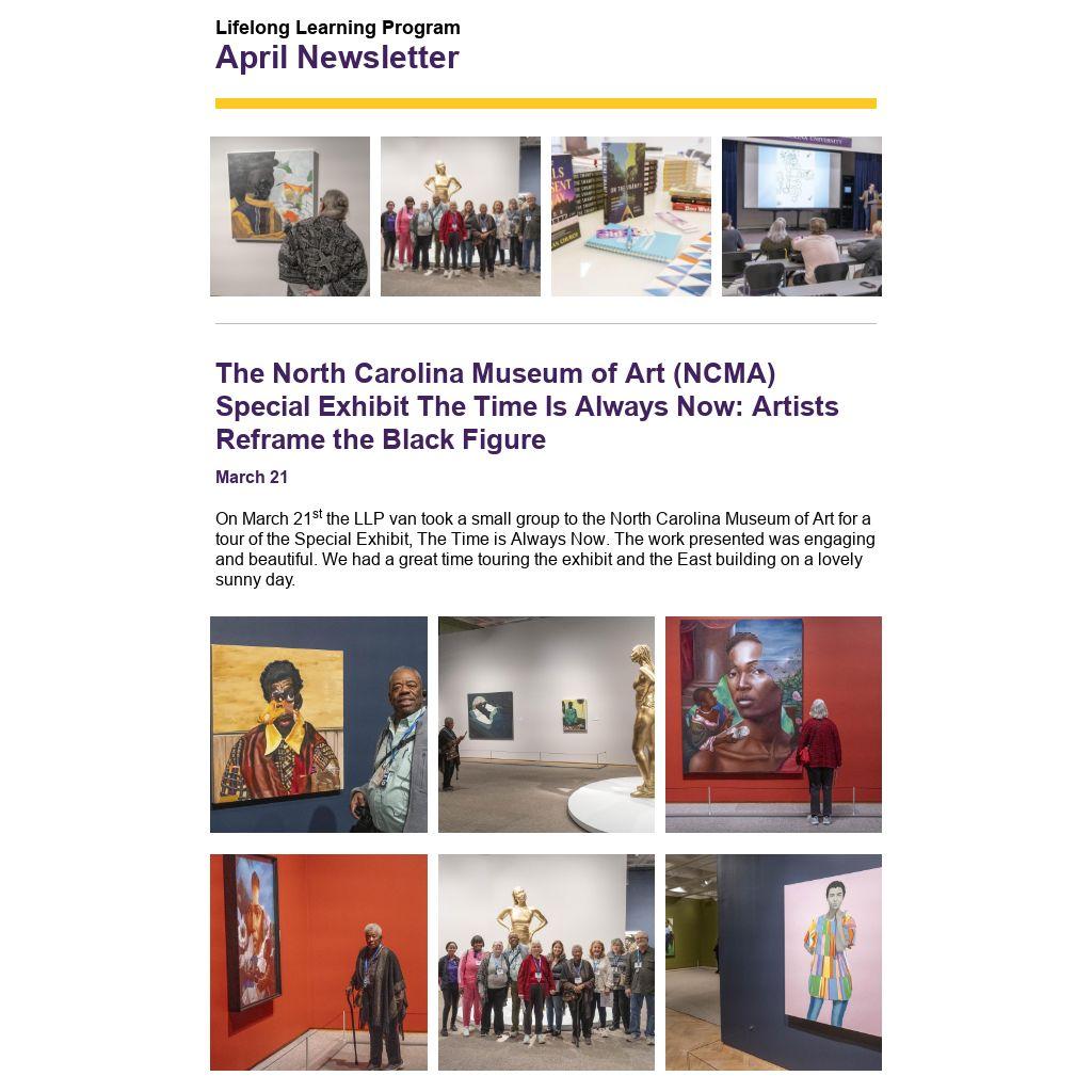 On March 21st the LLP van took a small group to the North Carolina Museum of Art for a tour of the Special Exhibit, The Time is Always Now. The work presented was engaging and beautiful. We had a great time touring the exhibit and the East building on a lovely sunny day.