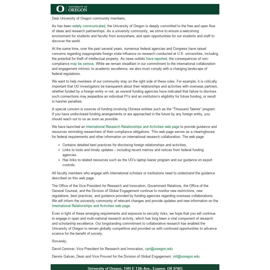 Even in light of these emerging requirements and exposure to security risks, we hope that you will continue to engage in open and multi-national research activity, which has long been a vital component of research and scholarship excellence. Our longstanding commitment to collaborative research has enabled the University of Oregon to remain globally competitive and provided us with continued opportunities to advance science for the benefit of society.