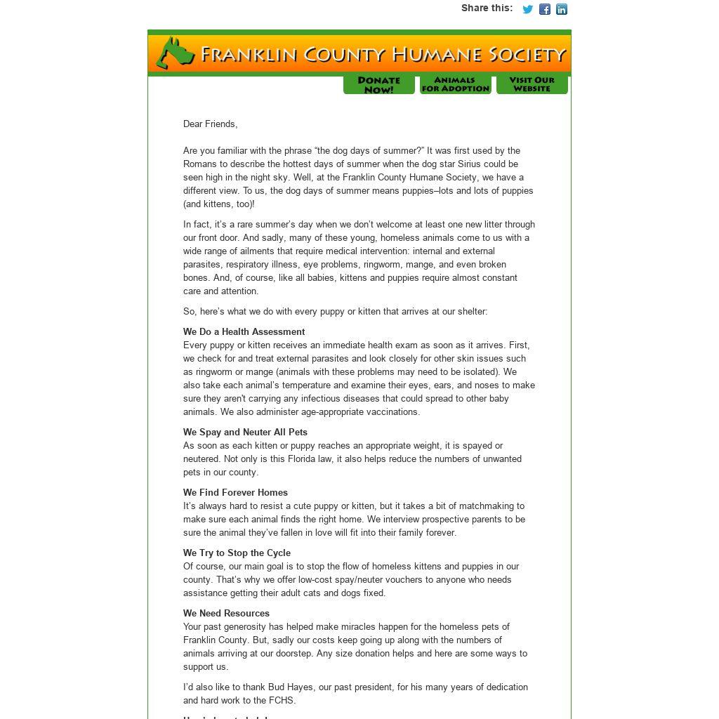 Are you familiar with the phrase āthe dog days of summer?ā It was first used by the Romans to describe the hottest days of summer when the dog star Sirius could be seen high in the night sky. Well, at the Franklin County Humane Society, we have a different view. To us, the dog days of summer means puppiesālots and lots of puppies (and kittens, too)!