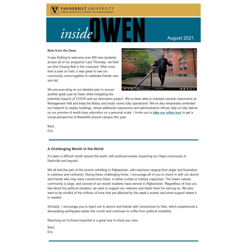 We all feel the pain of the events unfolding in Afghanistan, with reactions ranging from anger and frustration to sadness and confusion. During these challenging times, I encourage all of you to check in with our alumni and friends who may have connections there, in either civilian or military capacities. The Owen veteran community is large, and several of our recent students have served in Afghanistan. Regardless of how you feel about the political situation, we want to support our veterans and thank them for serving us. We also want to be mindful of the millions of lives that are affected by the week’s events and show support where it is needed.
