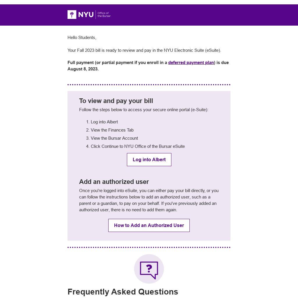 Once you're logged into eSuite, you can either pay your bill directly, or you can follow the instructions below to add an authorized user, such as a parent or a guardian, to pay on your behalf. If you've previously added an authorized user, there is no need to add them again.