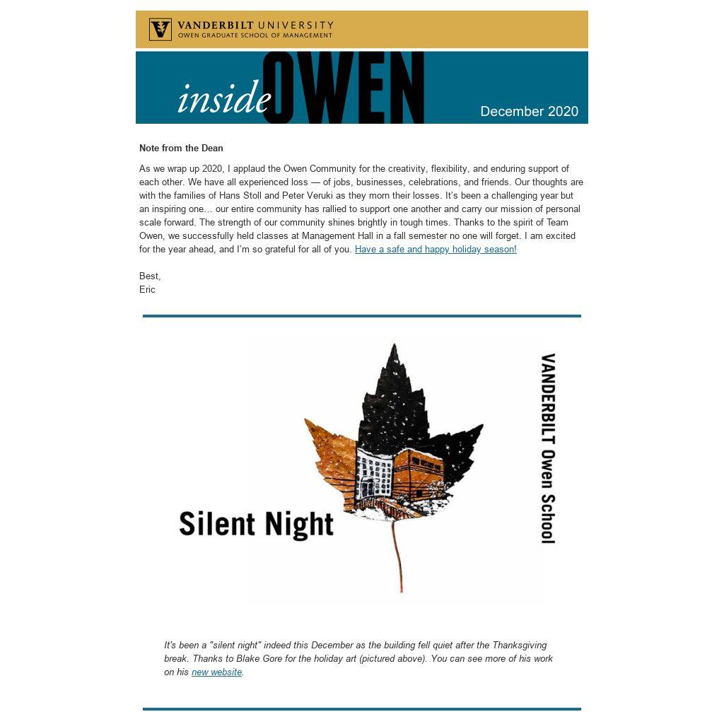 As we wrap up 2020, I applaud the Owen Community for the creativity, flexibility, and enduring support of each other. We have all experienced loss — of jobs, businesses, celebrations, and friends. Our thoughts are with the families of Hans Stoll and Peter Veruki as they morn their losses. It’s been a challenging year but an inspiring one… our entire community has rallied to support one another and carry our mission of personal scale forward. The strength of our community shines brightly in tough times. Thanks to the spirit of Team Owen, we successfully held classes at Management Hall in a fall semester no one will forget. I am excited for the year ahead, and I’m so grateful for all of you. Have a safe and happy holiday season!