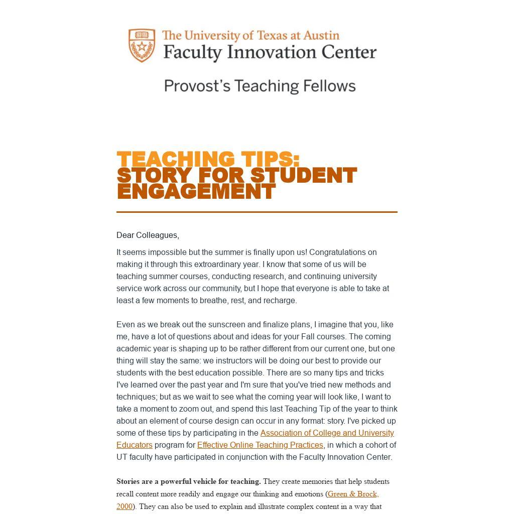Even as we break out the sunscreen and finalize plans, I imagine that you, like me, have a lot of questions about and ideas for your Fall courses. The coming academic year is shaping up to be rather different from our current one, but one thing will stay the same: we instructors will be doing our best to provide our students with the best education possible. There are so many tips and tricks I've learned over the past year and I'm sure that you've tried new methods and techniques; but as we wait to see what the coming year will look like, I want to take a moment to zoom out, and spend this last Teaching Tip of the year to think about an element of course design can occur in any format: story. I've picked up some of these tips by participating in the Association of College and University Educators program for Effective Online Teaching Practices, in which a cohort of UT faculty have participated in conjunction with the Faculty Innovation Center.