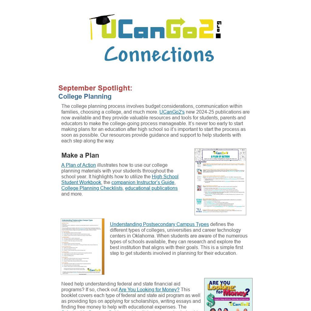 The college planning process involves budget considerations, communication within families, choosing a college, and much more. UCanGo2's new 2024-25 publications are now available and they provide valuable resources and tools for students, parents and educators to make the college-going process manageable. It’s never too early to start making plans for an education after high school so it’s important to start the process as soon as possible. Our resources provide guidance and support to help students with each step along the way.