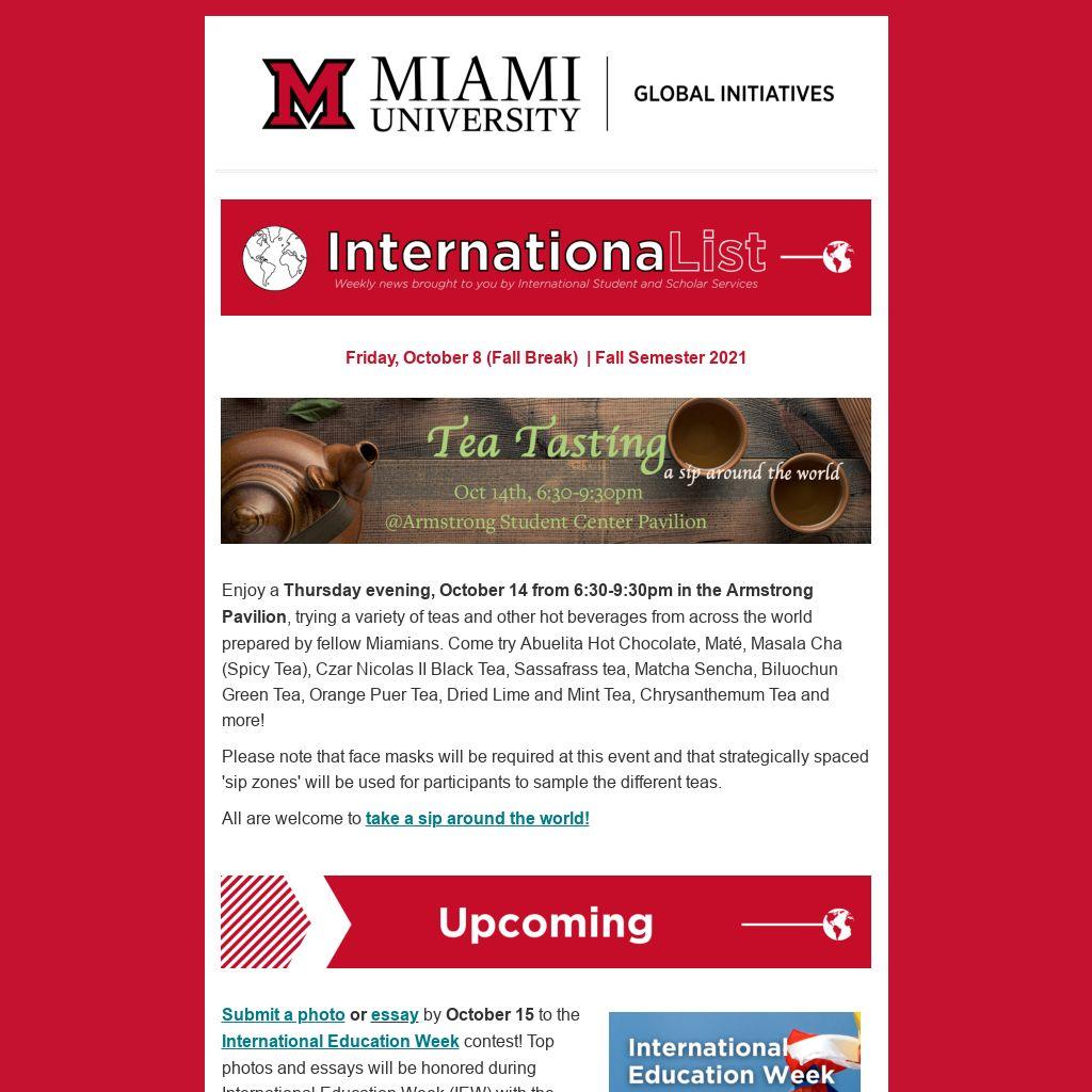 Enjoy a Thursday evening, October 14 from 6:30-9:30pm in the Armstrong Pavilion, trying a variety of teas and other hot beverages from across the world prepared by fellow Miamians. Come try Abuelita Hot Chocolate, Maté, Masala Cha (Spicy Tea), Czar Nicolas II Black Tea, Sassafrass tea, Matcha Sencha, Biluochun Green Tea, Orange Puer Tea, Dried Lime and Mint Tea, Chrysanthemum Tea and more!