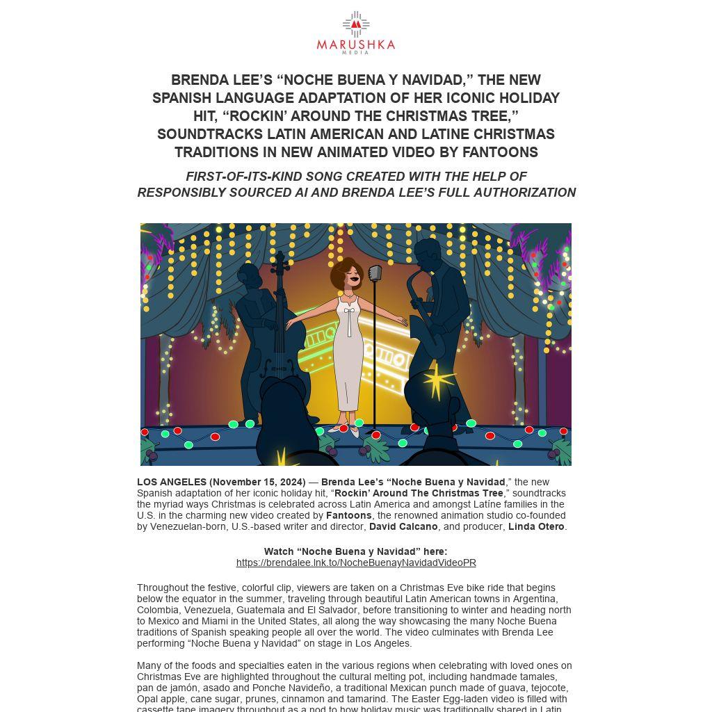 BRENDA LEE’S “NOCHE BUENA Y NAVIDAD,” THE NEW SPANISH LANGUAGE ADAPTATION OF HER ICONIC HOLIDAY HIT, “ROCKIN’ AROUND THE CHRISTMAS TREE,” SOUNDTRACKS LATIN AMERICAN AND LATINE CHRISTMAS TRADITIONS IN NEW ANIMATED VIDEO BY FANTOONS