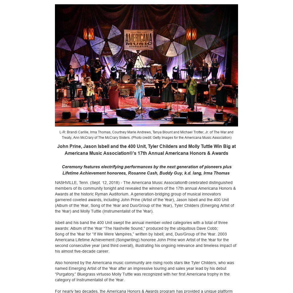 | NASHVILLE, Tenn. (Sept. 12, 2018) - The Americana Music Association® celebrated distinguished members of its community tonight and revealed the winners of the 17th annual Americana Honors & Awards at the historic Ryman Auditorium. A generation-bridging group of musical innovators garnered coveted awards, including John Prine (Artist of the Year), Jason Isbell and the 400 Unit (Album of the Year, Song of the Year and Duo/Group of the Year), Tyler Childers (Emerging Artist of the Year) and Molly Tuttle (Instrumentalist of the Year).