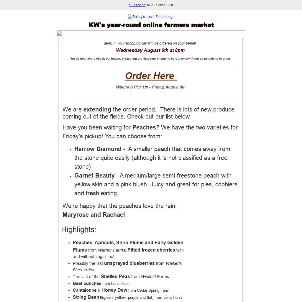 Stop in to our mid week market in downtown Kitchener every Tuesday!  Ordering is open Friday to Monday so you can pre-order Bulk Fruit at baileyslocafoods.ca/ordering