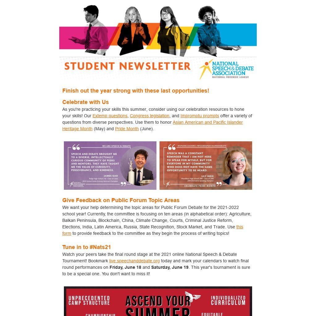 Tune in to #Nats21 Watch your peers take the final round stage at the 2021 online National Speech & Debate Tournament! Bookmark live.speechanddebate.org today and mark your calendars to watch final round performances on Friday, June 18 and Saturday, June 19. This year's tournament is sure to be a special one. You don't want to miss it!