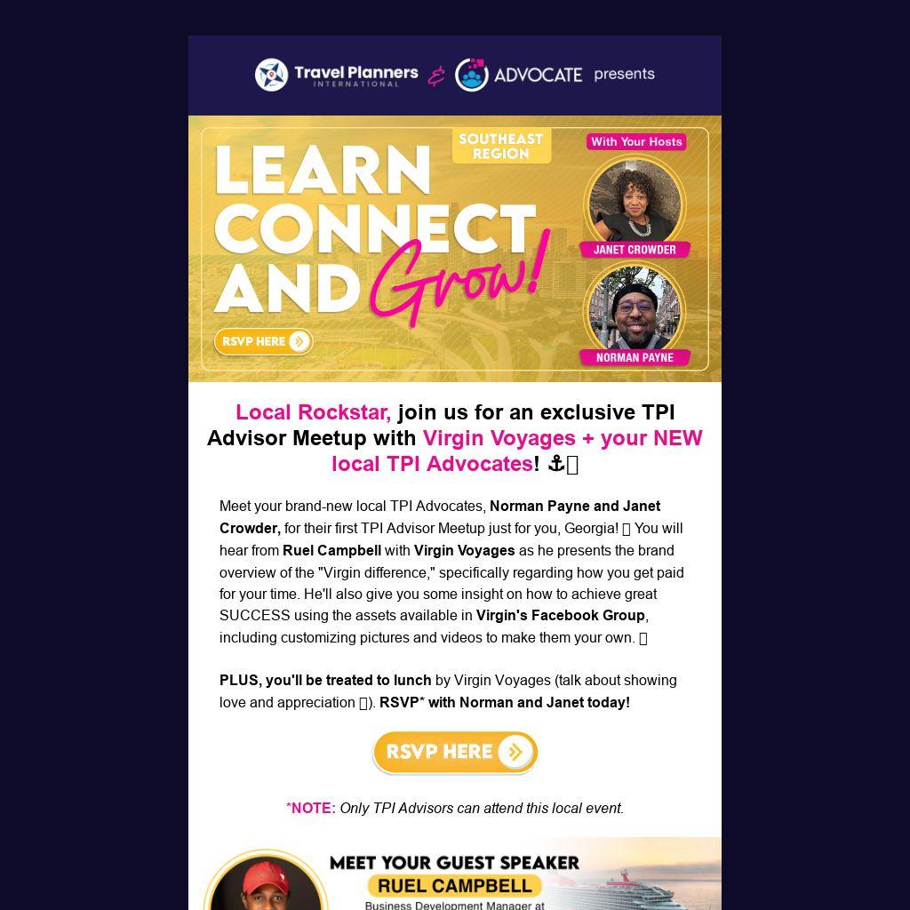 Meet your brand-new local TPI Advocates, Norman Payne and Janet Crowder, for their first TPI Advisor Meetup just for you, Georgia! π You will hear from Ruel Campbell with Virgin Voyages as he presents the brand overview of the "Virgin difference," specifically regarding how you get paid for your time. He'll also give you some insight on how to achieve great SUCCESS using the assets available in Virgin's Facebook Group, including customizing pictures and videos to make them your own. π