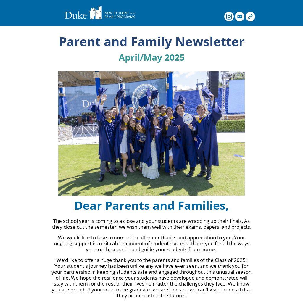The 2025 Senior Survey is now LIVE!! Encourage your senior to check their emails for the survey link and info. This is a great opportunity for students to share their Duke experience and what they plan to do after Duke.