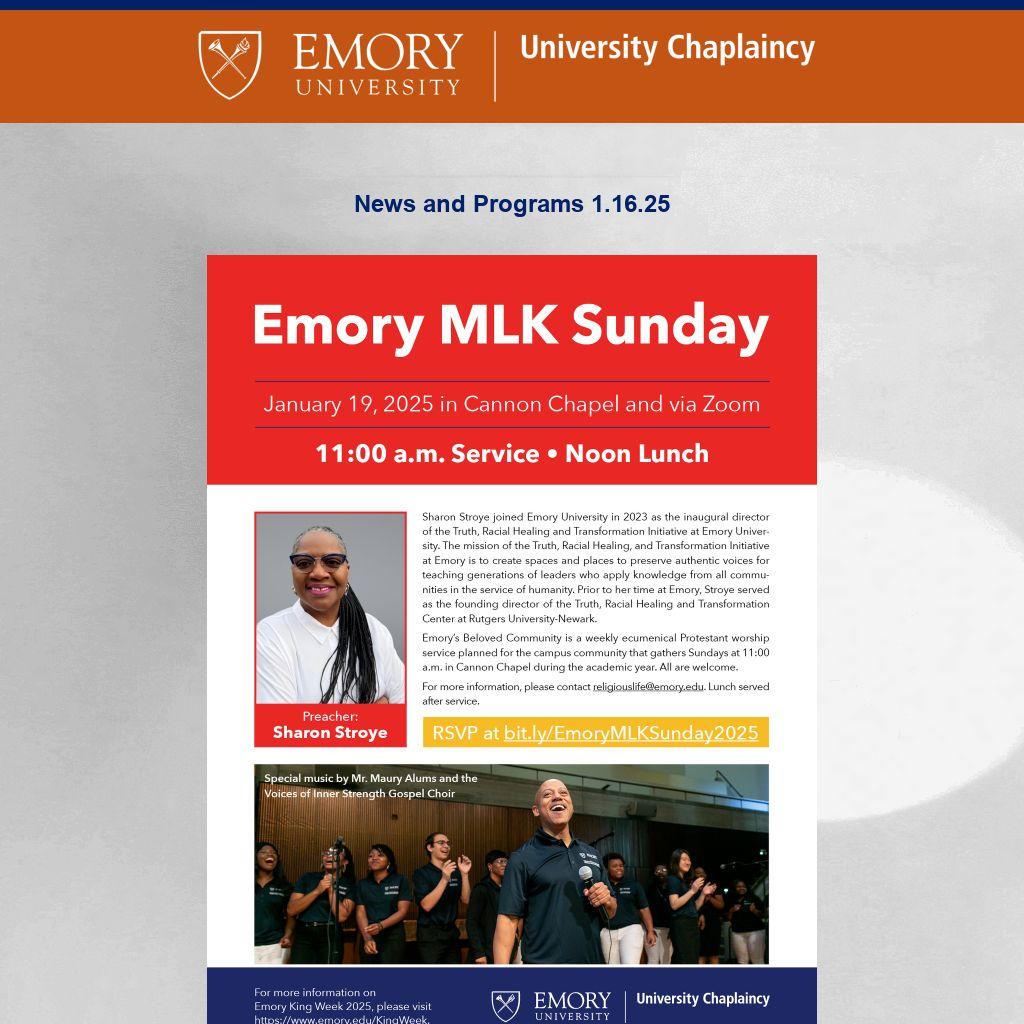 Emory University Chaplaincy ENews is published weekly during term publicizing Atlanta-campus spiritual life programs. It is not a comprehensive listing. For Oxford College spiritual life, please click here. To submit information or to update your preferences, please contact religiouslife@emory.edu.