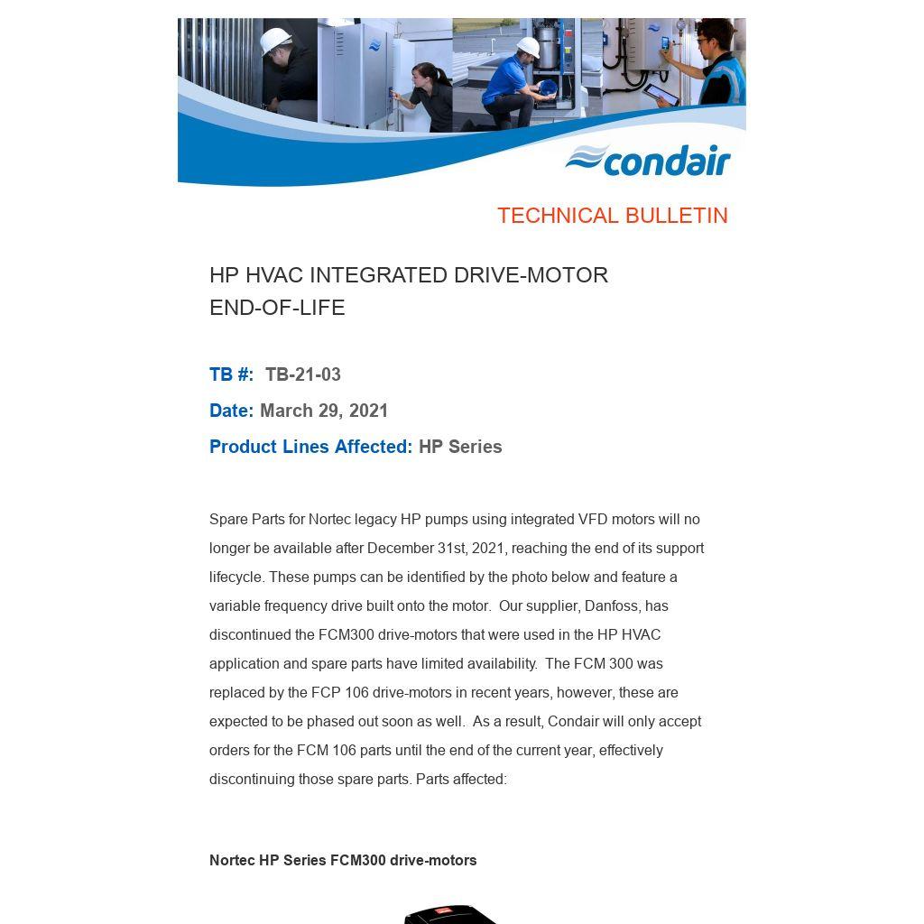 Spare Parts for Nortec legacy HP pumps using integrated VFD motors will no longer be available after December 31st, 2021, reaching the end of its support lifecycle. These pumps can be identified by the photo below and feature a variable frequency drive built onto the motor. Our supplier, Danfoss, has discontinued the FCM300 drive-motors that were used in the HP HVAC application and spare parts have limited availability. The FCM 300 was replaced by the FCP 106 drive-motors in recent years, however, these are expected to be phased out soon as well. As a result, Condair will only accept orders for the FCM 106 parts until the end of the current year, effectively discontinuing those spare parts. Parts affected:
