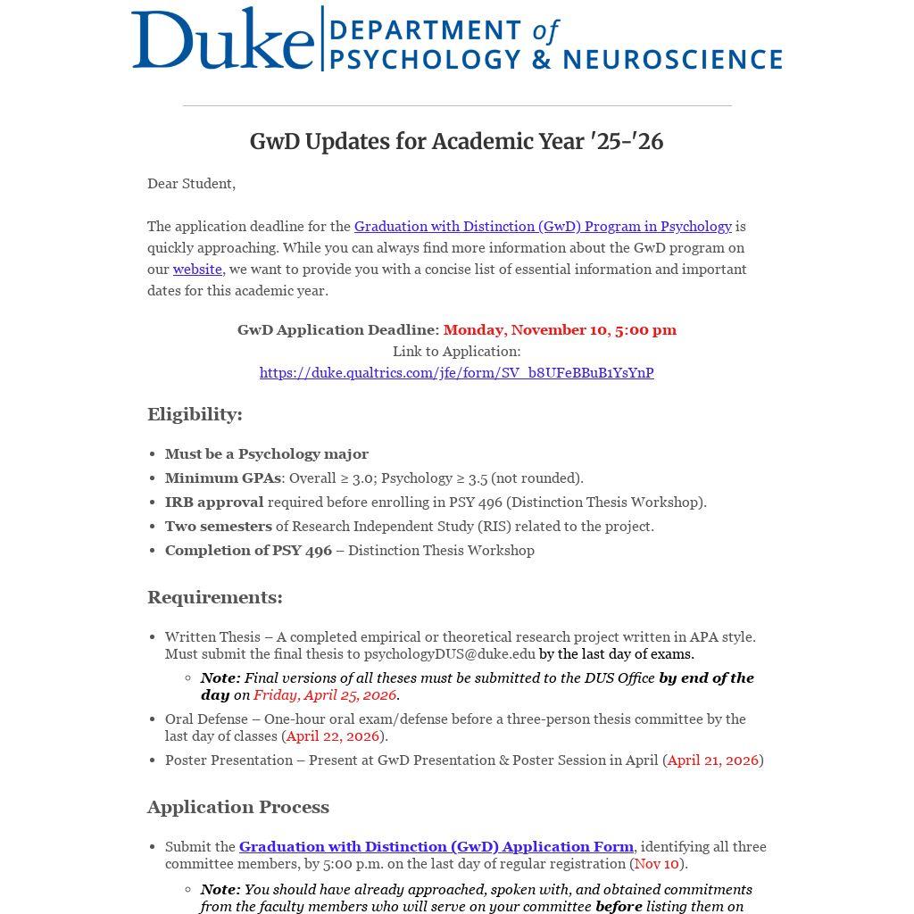 The application deadline for the Graduation with Distinction (GwD) Program in Psychology is quickly approaching. While you can always find more information about the GwD program on our website, we want to provide you with a concise list of essential information and important dates for this academic year.