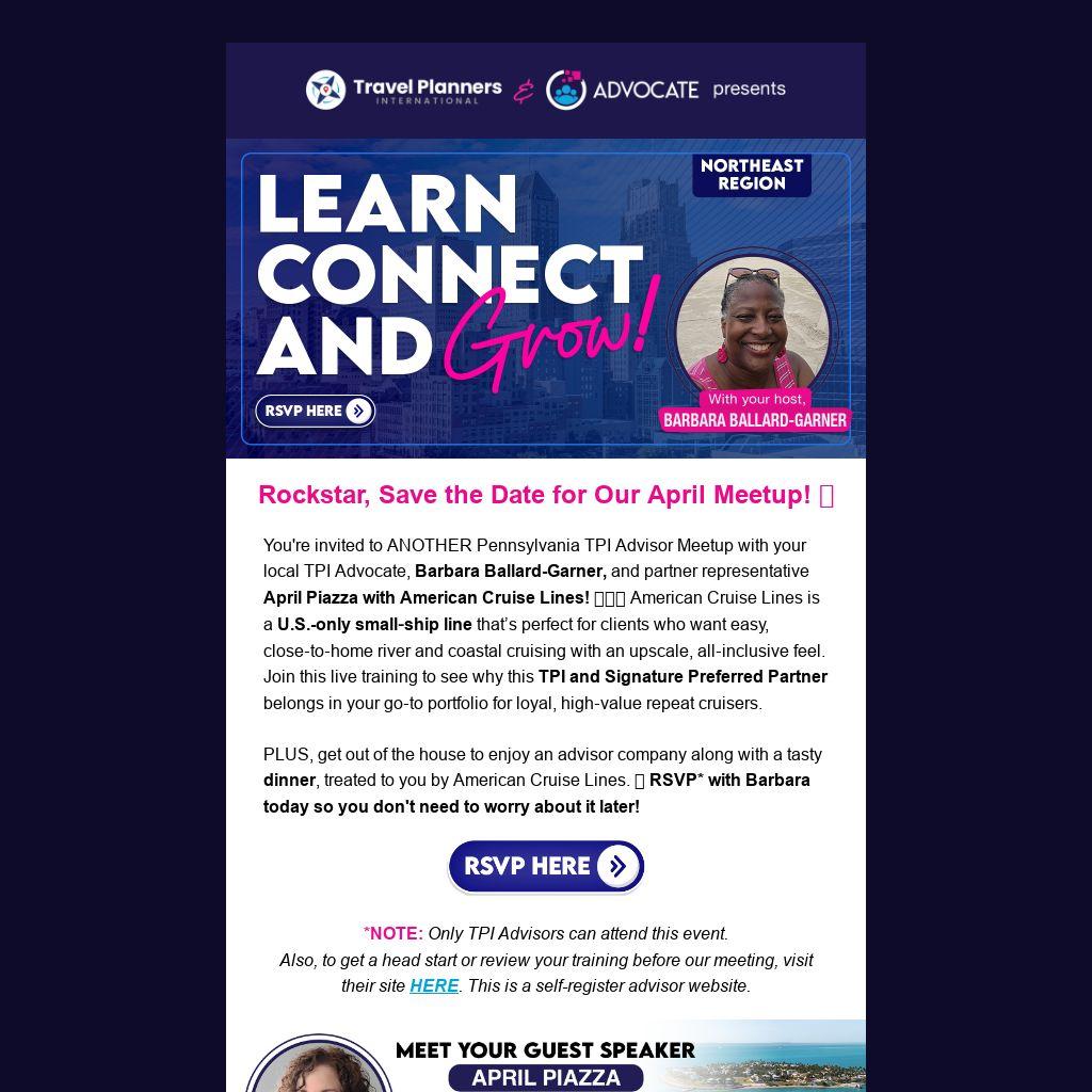 You're invited to ANOTHER Pennsylvania TPI Advisor Meetup with your local TPI Advocate, Barbara Ballard-Garner, and partner representative April Piazza with American Cruise Lines! 🛳️🇺🇸 American Cruise Lines is a U.S.-only small‑ship line that’s perfect for clients who want easy, close‑to‑home river and coastal cruising with an upscale, all‑inclusive feel. Join this live training to see why this TPI and Signature Preferred Partner belongs in your go‑to portfolio for loyal, high‑value repeat cruisers.