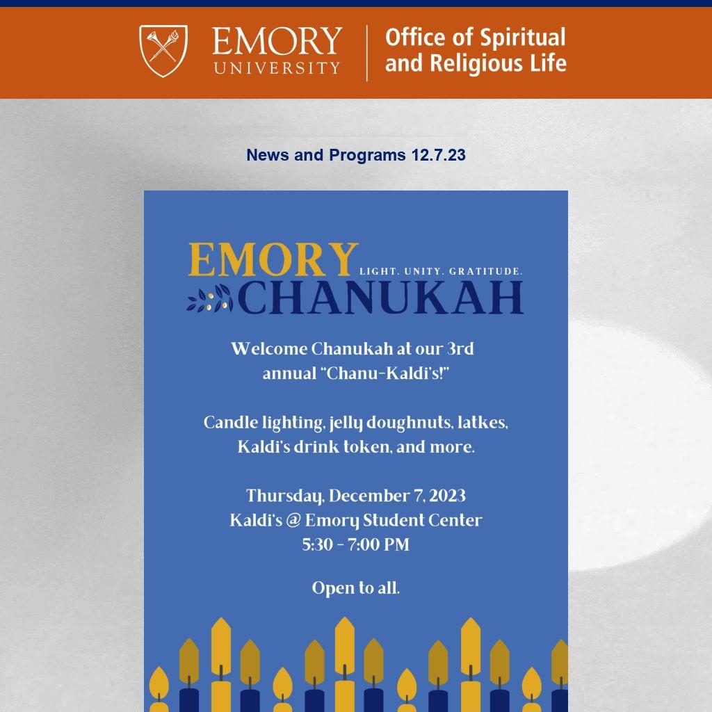 Emory OSRL ENews is published weekly during term by the Emory University Office of Spiritual and Religious Life publicizing Atlanta-campus spiritual life programs. It is not a comprehensive listing. For Oxford College spiritual life, please click here. To submit information or to update your preferences, please contact religiouslife@emory.edu.