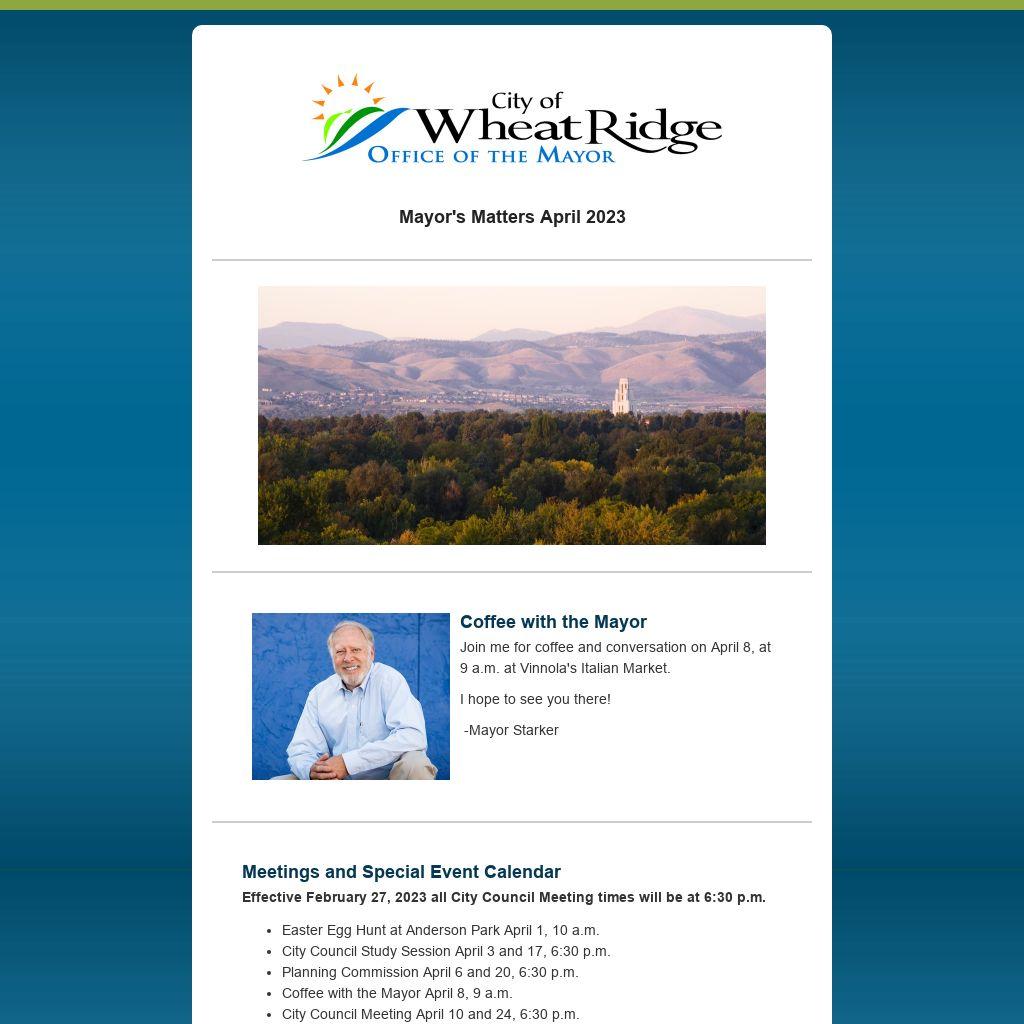 Coffee with the MayorJoin me for coffee and conversation on April 8, at 9 a.m. at Vinnola's Italian Market.