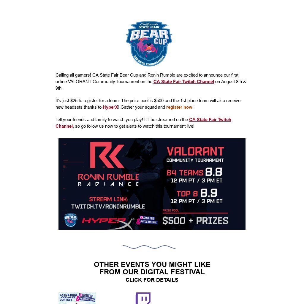 Calling all gamers! CA State Fair Bear Cup and Ronin Rumble are excited to announce our first online VALORANT Community Tournament on the CA State Fair Twitch Channel on August 8th & 9th.