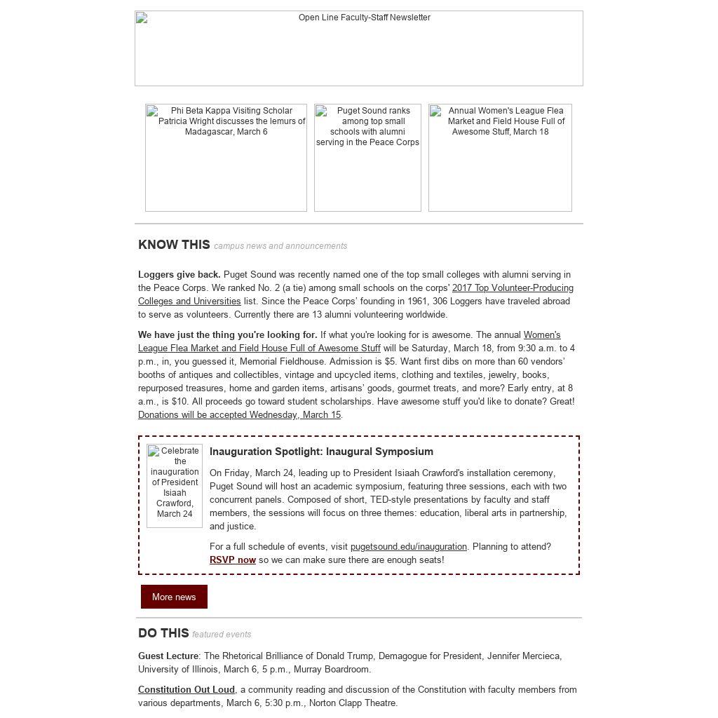Constitution Out Loud, a community reading and discussion of the Constitution with faculty members from various departments, March 6, 5:30 p.m., Norton Clapp Theatre.