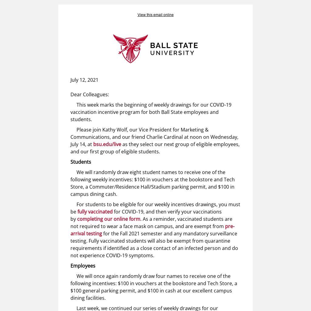 This week marks the beginning of weekly drawings for our COVID-19 vaccination incentive program for both Ball State employees and students.