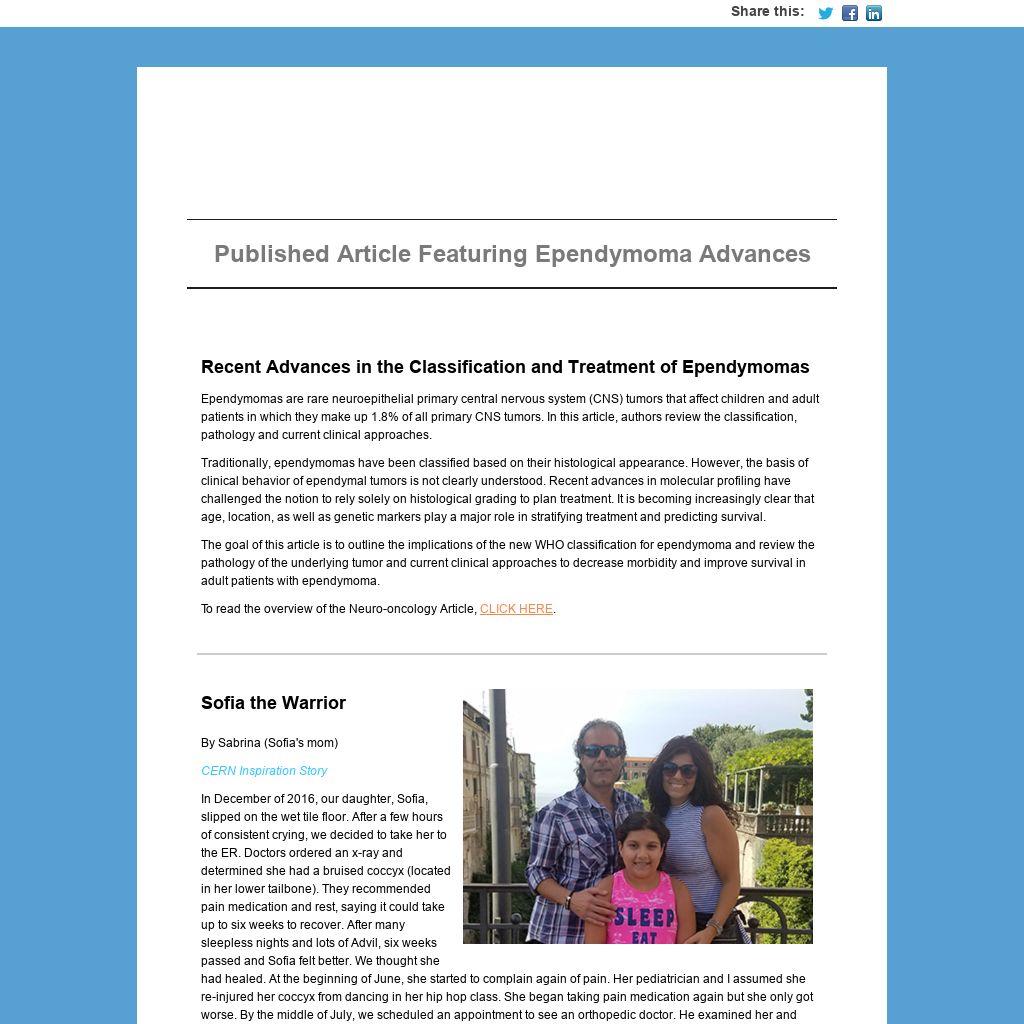 The next day we saw a neurosurgeon who confirmed that it was probably a mxyopapillary ependymoma based on the tumor’s location. That night, she had a total brain and spine MRI, which thankfully, confirmed no other tumors. On July 31, 2017, she was scheduled for surgery. After six hours, we met with the doctor who was able to perform a total resection. He also assured us that these tumors are usually benign and radiation wouldn't be necessary. Two weeks later, the pathology reports came back and showed some mitosis and Ki-67 of 14%. Again, the doctor felt confident that the tumor was gone and suggested just keeping an eye on it.