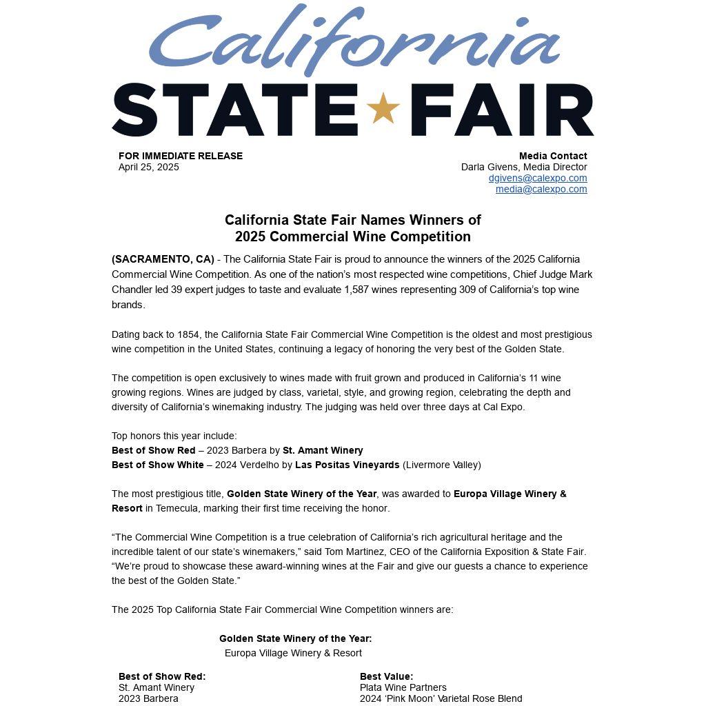 (SACRAMENTO, CA) - The California State Fair is proud to announce the winners of the 2025 California Commercial Wine Competition. As one of the nation’s most respected wine competitions, Chief Judge Mark Chandler led 39 expert judges to taste and evaluate 1,587 wines representing 309 of California’s top wine brands.