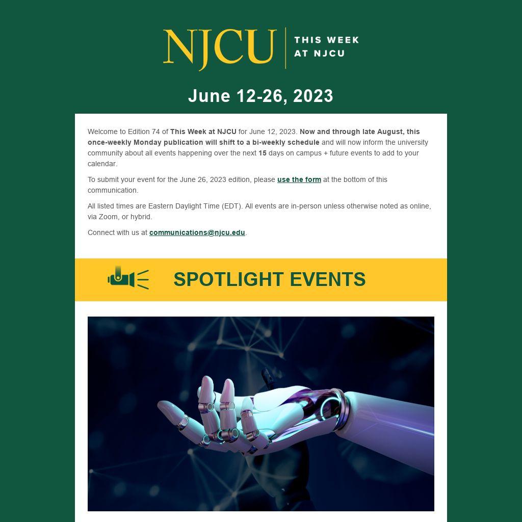 Welcome to Edition 74 of This Week at NJCU for June 12, 2023. Now and through late August, this once-weekly Monday publication will shift to a bi-weekly schedule and will now inform the university community about all events happening over the next 15 days on campus + future events to add to your calendar.