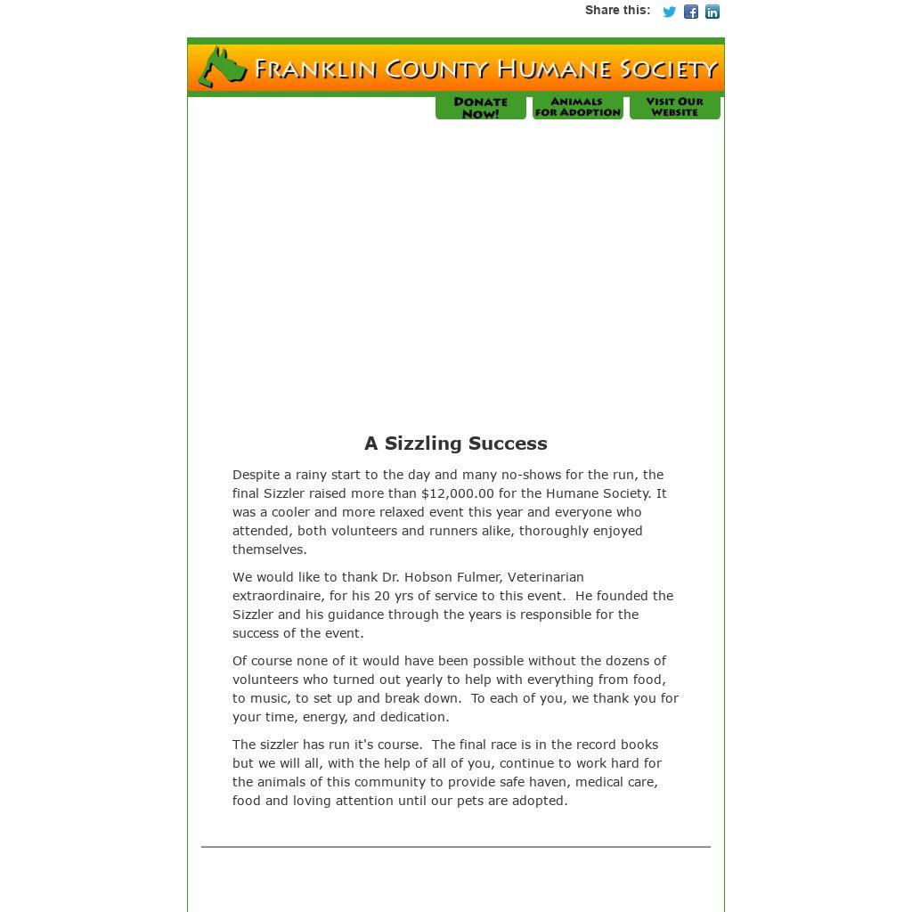 The sizzler has run it's course. The final race is in the record books but we will all, with the help of all of you, continue to work hard for the animals of this community to provide safe haven, medical care, food and loving attention until our pets are adopted.