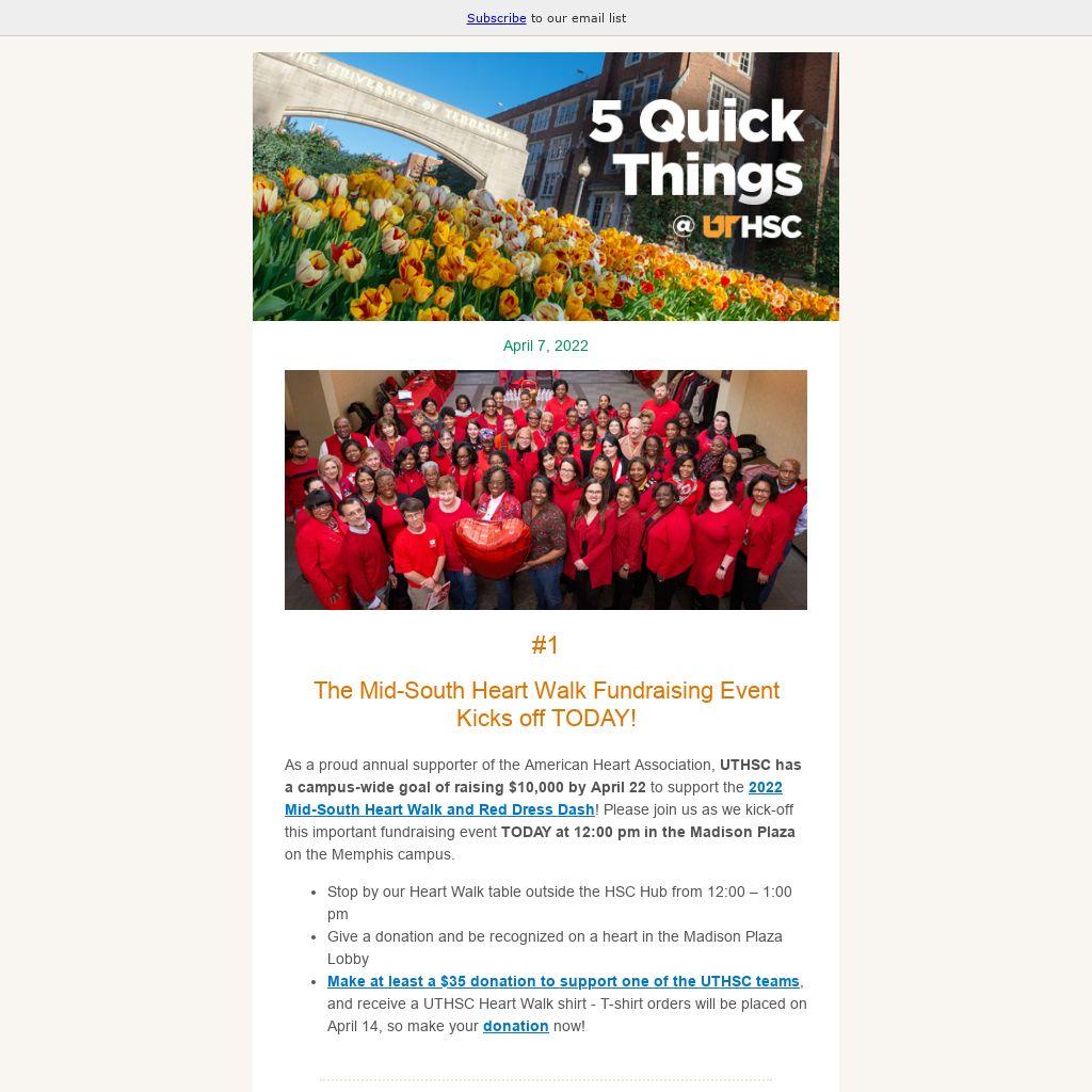 As a proud annual supporter of the American Heart Association, UTHSC has a campus-wide goal of raising $10,000 by April 22 to support the 2022 Mid-South Heart Walk and Red Dress Dash! Please join us as we kick-off this important fundraising event TODAY at 12:00 pm in the Madison Plaza on the Memphis campus.