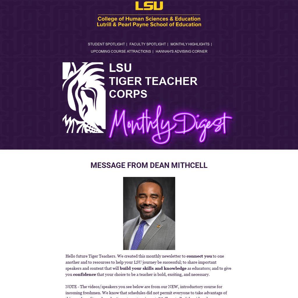 Hello future Tiger Teachers. We created this monthly newsletter to connect you to one another and to resources to help your LSU journey be successful; to share important speakers and content that will build your skills and knowledge as educators; and to give you confidence that your choice to be a teacher is bold, exciting, and necessary.