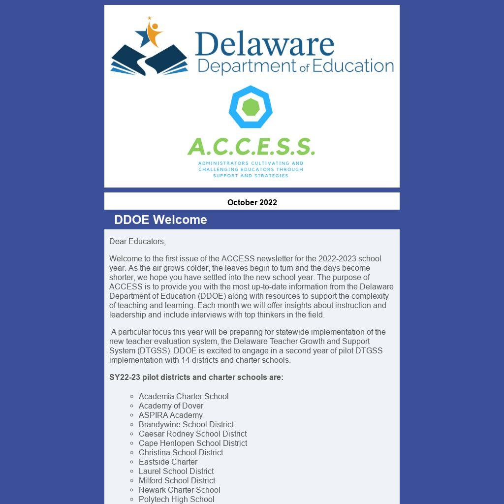 ACCESS eNewsletter – Read Delaware’s monthly eNewsletter focused on school staff evaluations. Sign up to receive future issues. Click here to view previous issues. email Evaluation@doe.k12.de.us