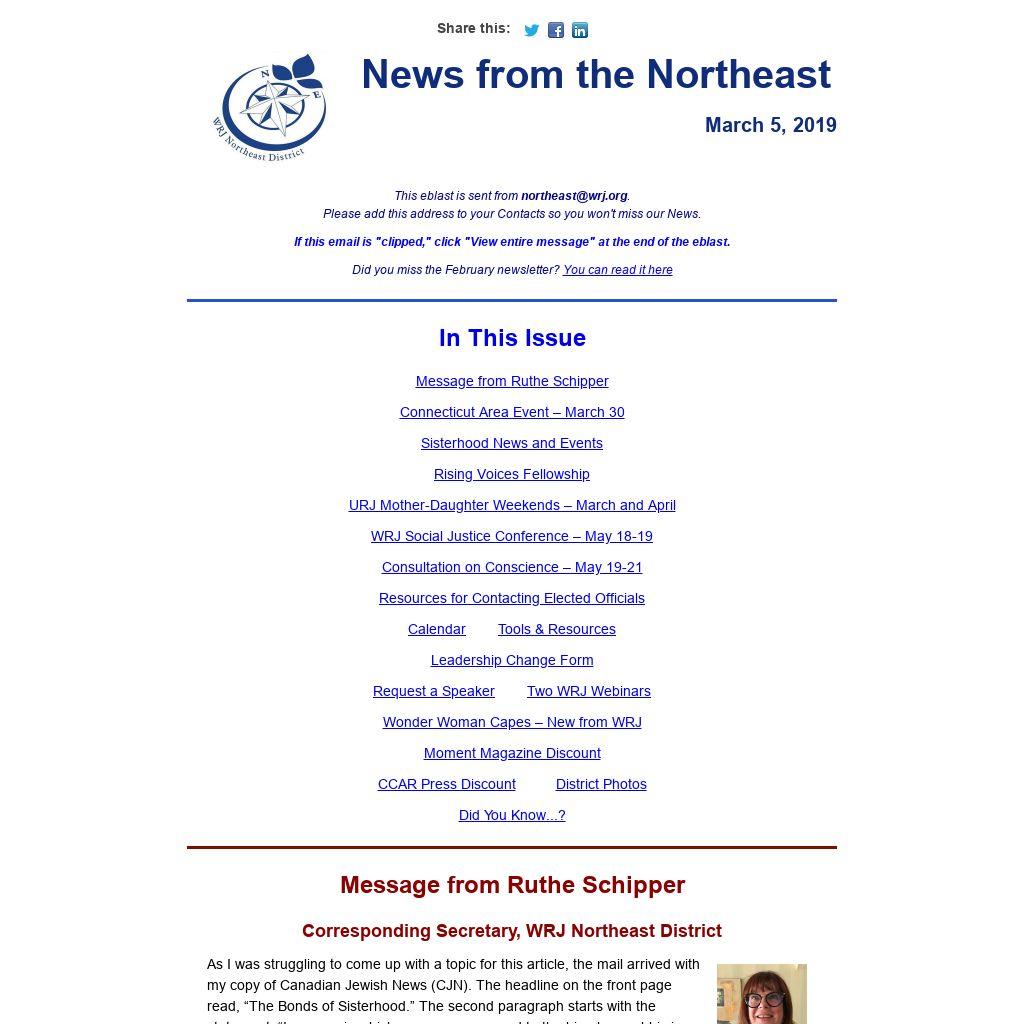 Message from Ruthe Schipper Corresponding Secretary, WRJ Northeast District
