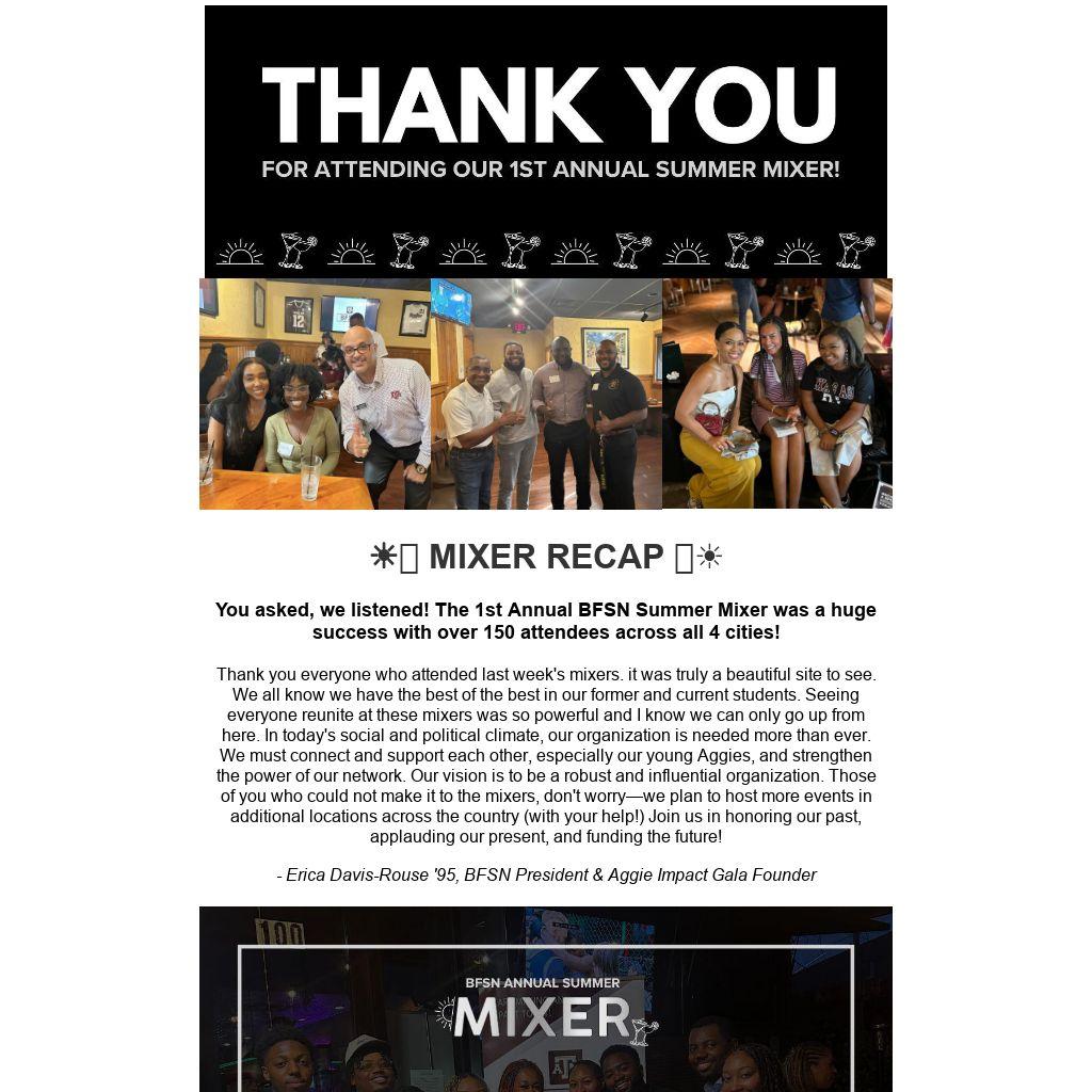 Thank you everyone who attended last week's mixers. it was truly a beautiful site to see. We all know we have the best of the best in our former and current students. Seeing everyone reunite at these mixers was so powerful and I know we can only go up from here. In today's social and political climate, our organization is needed more than ever. We must connect and support each other, especially our young Aggies, and strengthen the power of our network. Our vision is to be a robust and influential organization. Those of you who could not make it to the mixers, don't worry—we plan to host more events in additional locations across the country (with your help!) Join us in honoring our past, applauding our present, and funding the future!