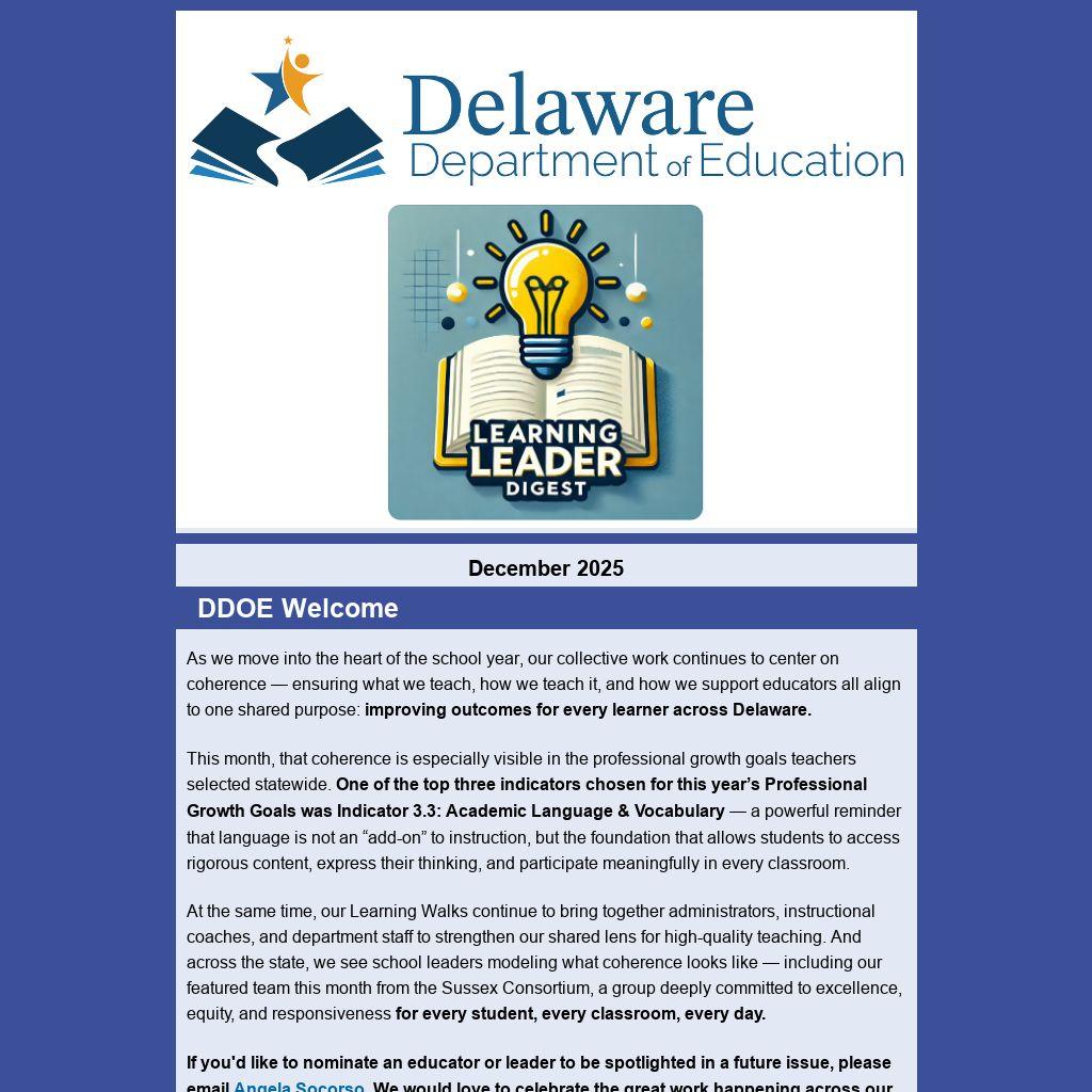 As we move into the heart of the school year, our collective work continues to center on coherence — ensuring what we teach, how we teach it, and how we support educators all align to one shared purpose: improving outcomes for every learner across Delaware.