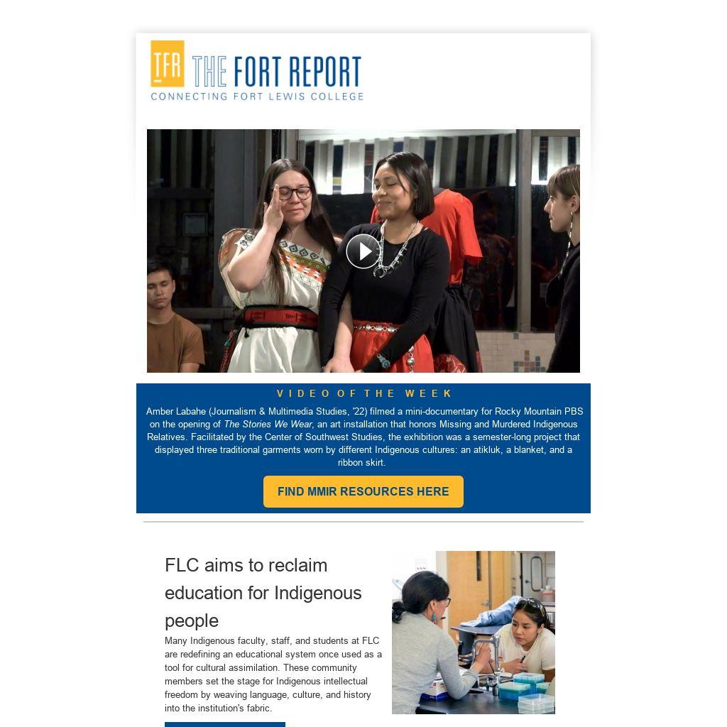Amber Labahe (Journalism & Multimedia Studies, '22) filmed a mini-documentary for Rocky Mountain PBS on the opening of The Stories We Wear, an art installation that honors Missing and Murdered Indigenous Relatives. Facilitated by the Center of Southwest Studies, the exhibition was a semester-long project that displayed three traditional garments worn by different Indigenous cultures: an atikluk, a blanket, and a ribbon skirt.