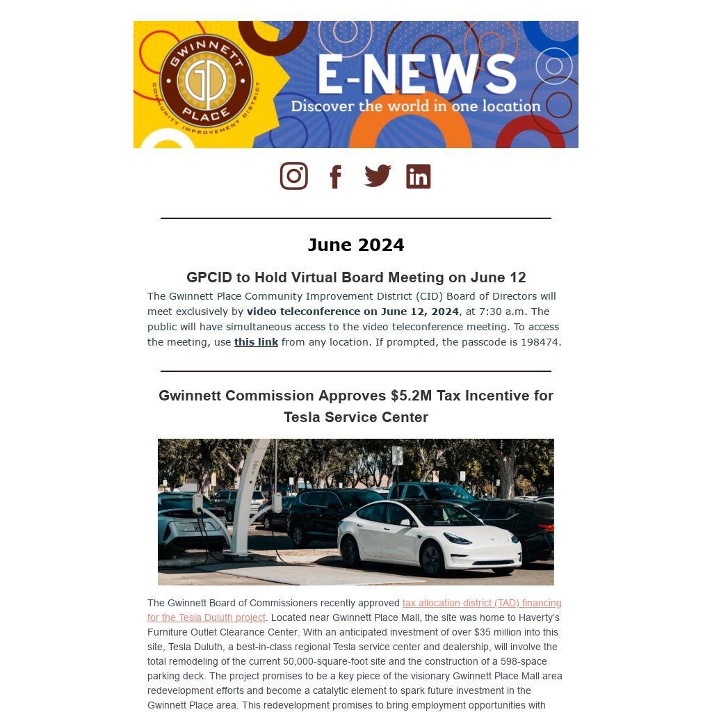The Gwinnett Board of Commissioners recently approved tax allocation district (TAD) financing for the Tesla Duluth project. Located near Gwinnett Place Mall, the site was home to Haverty’s Furniture Outlet Clearance Center. With an anticipated investment of over $35 million into this site, Tesla Duluth, a best-in-class regional Tesla service center and dealership, will involve the total remodeling of the current 50,000-square-foot site and the construction of a 598-space parking deck. The project promises to be a key piece of the visionary Gwinnett Place Mall area redevelopment efforts and become a catalytic element to spark future investment in the Gwinnett Place area. This redevelopment promises to bring employment opportunities with livable wages to Gwinnett residents and increase public revenues to Gwinnett through increased property taxes, sales taxes, and auto title taxes. Additionally, the investment in this property will benefit surrounding properties through “halo effect” impacts.