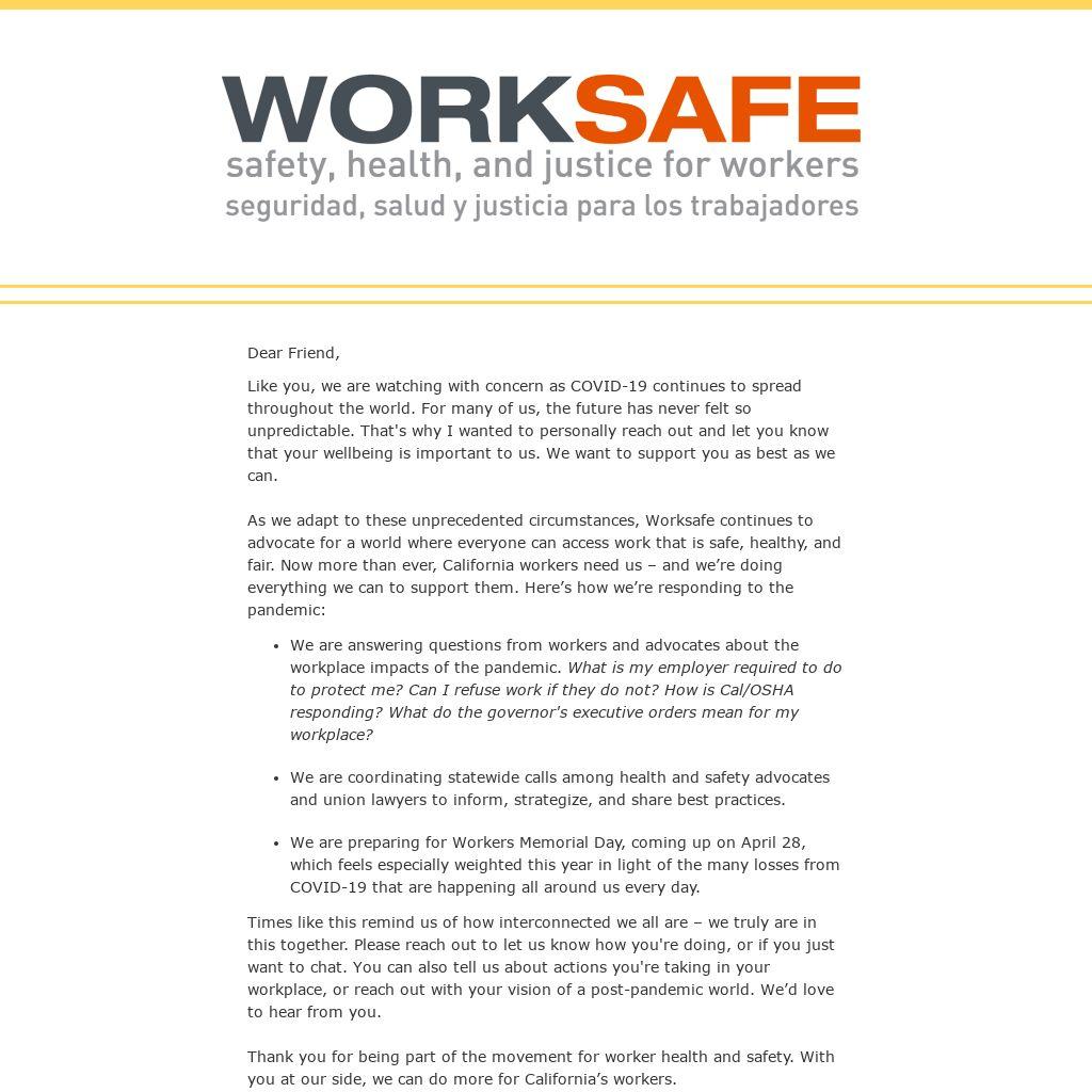 As we adapt to these unprecedented circumstances, Worksafe continues to advocate for a world where everyone can access work that is safe, healthy, and fair. Now more than ever, California workers need us – and we’re doing everything we can to support them. Here’s how we’re responding to the pandemic: