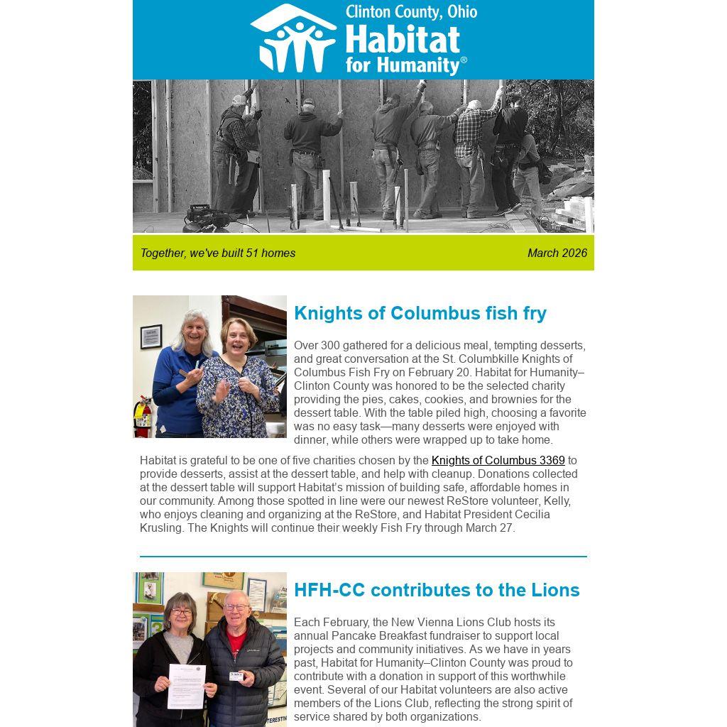Each February, the New Vienna Lions Club hosts its annual Pancake Breakfast fundraiser to support local projects and community initiatives. As we have in years past, Habitat for Humanity–Clinton County was proud to contribute with a donation in support of this worthwhile event. Several of our Habitat volunteers are also active members of the Lions Club, reflecting the strong spirit of service shared by both organizations.