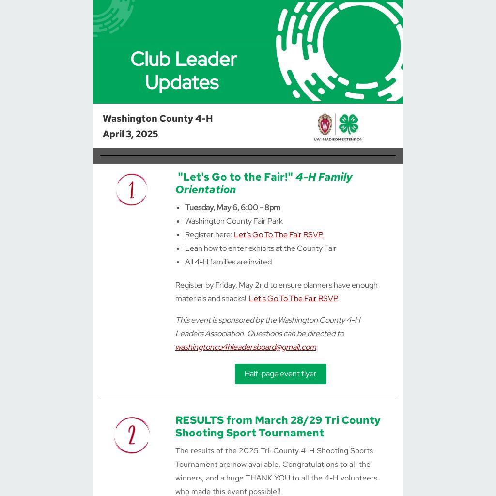 Steve Rohde from the West Bend Memorial Day Parade Planning Committee extends his personal invitation to all Washington County 4-H clubs to participate in the parade on Monday, May 26, 2025. More information and a sign-up form can be found here: West Bend Memorial Day Parade & Service