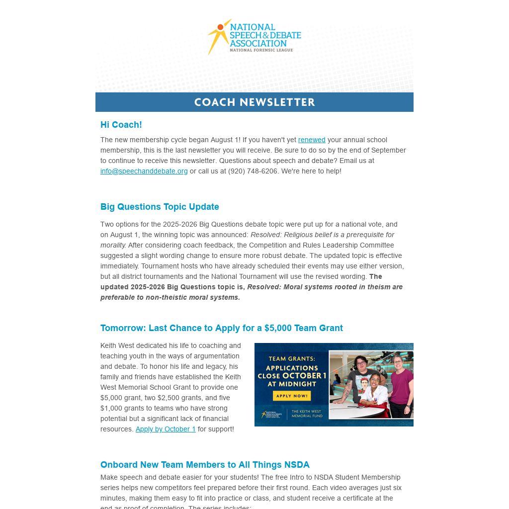 The new membership cycle began August 1! If you haven't yet renewed your annual school membership, this is the last newsletter you will receive. Be sure to do so by the end of September to continue to receive this newsletter. Questions about speech and debate? Email us at info@speechanddebate.org or call us at (920) 748-6206. We're here to help!