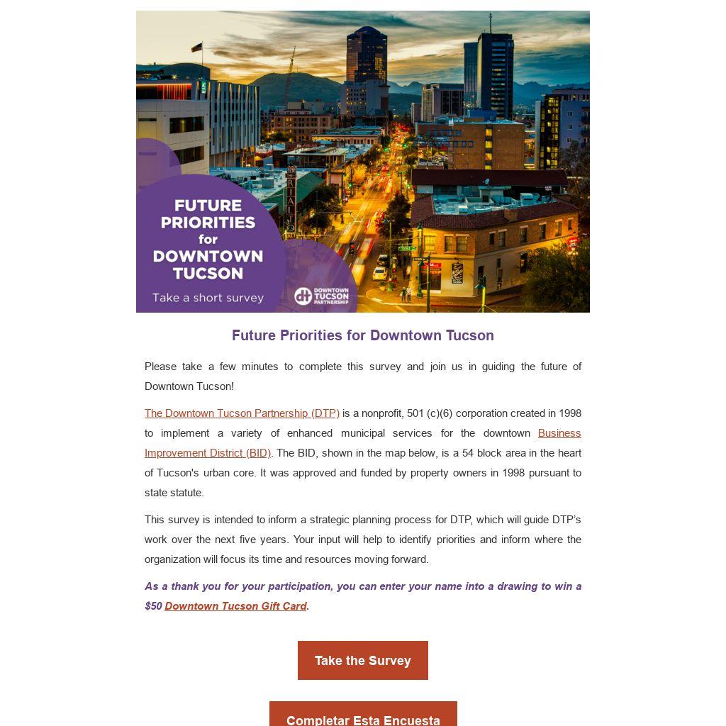 Please take a few minutes to complete this survey and join us in guiding the future of Downtown Tucson!