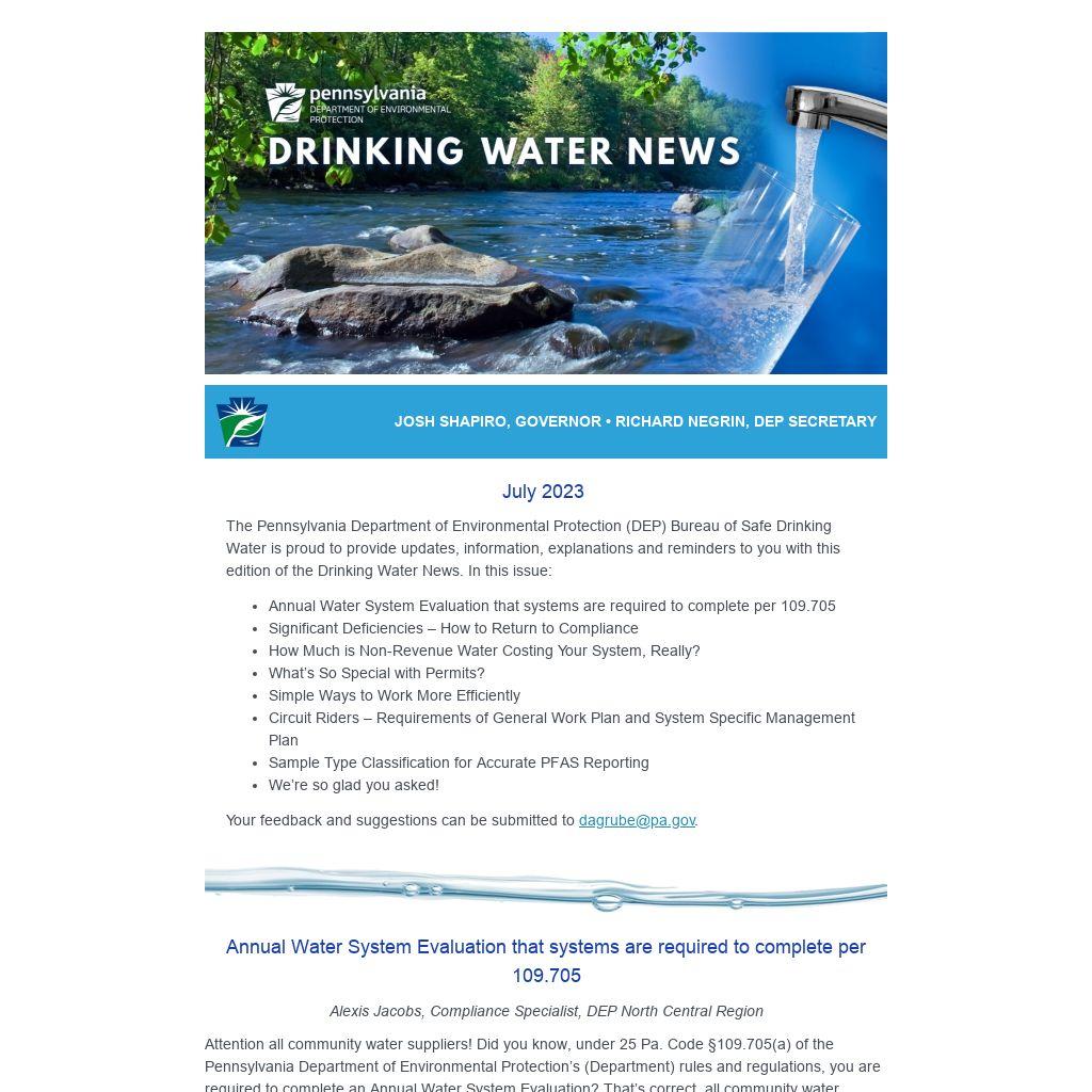 The Pennsylvania Department of Environmental Protection (DEP) Bureau of Safe Drinking Water is proud to provide updates, information, explanations and reminders to you with this edition of the Drinking Water News. In this issue: