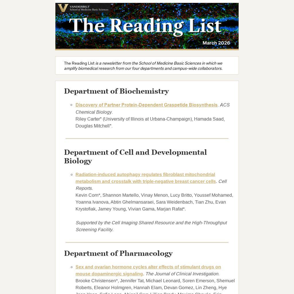 The Reading List is a newsletter from the School of Medicine Basic Sciences in which we amplify biomedical research from our four departments and campus-wide collaborators.