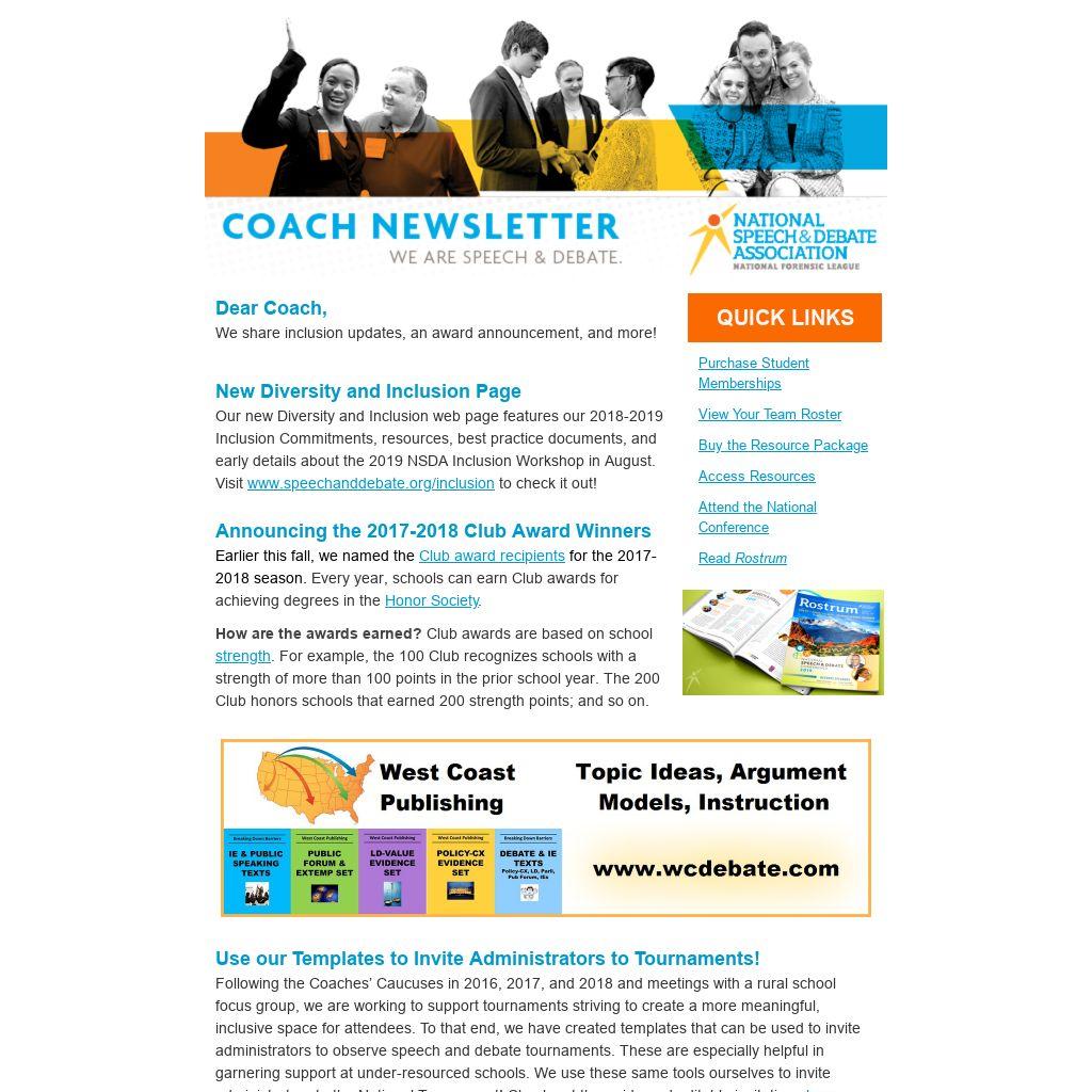 Our new Diversity and Inclusion web page features our 2018-2019 Inclusion Commitments, resources, best practice documents, and early details about the 2019 NSDA Inclusion Workshop in August. Visit www.speechanddebate.org/inclusion to check it out!