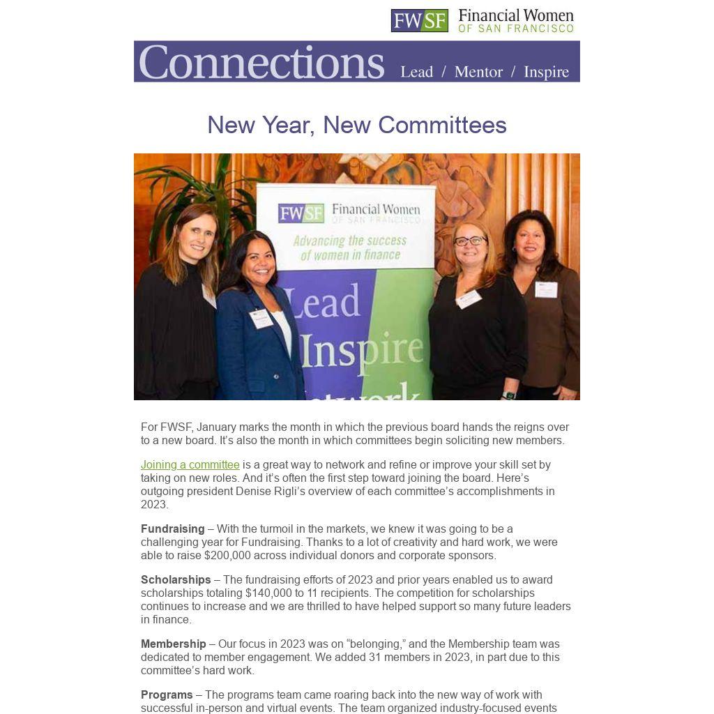 Joining a committee is a great way to network and refine or improve your skill set by taking on new roles. And it’s often the first step toward joining the board. Here’s outgoing president Denise Rigli’s overview of each committee’s accomplishments in 2023.