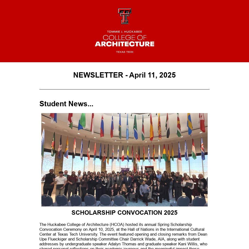 The Huckabee College of Architecture (HCOA) hosted its annual Spring Scholarship Convocation Ceremony on April 10, 2025, at the Hall of Nations in the International Cultural Center at Texas Tech University. The event featured opening and closing remarks from Dean Upe Flueckiger and Scholarship Committee Chair Darrick Wade, AIA, along with student addresses by undergraduate speaker Adalyn Thomas and graduate speaker Kani Willis, who shared personal reflections on their academic journeys and the meaningful impact these scholarships provide to themselves and their peers.