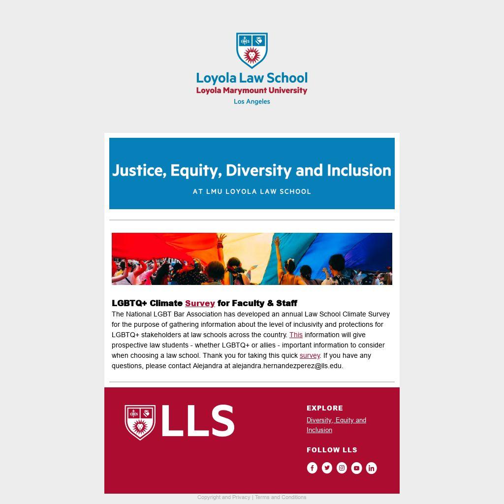 The National LGBT Bar Association has developed an annual Law School Climate Survey for the purpose of gathering information about the level of inclusivity and protections for LGBTQ+ stakeholders at law schools across the country. This information will give prospective law students - whether LGBTQ+ or allies - important information to consider when choosing a law school. Thank you for taking this quick survey. If you have any questions, please contact Alejandra at alejandra.hernandezperez@lls.edu.
