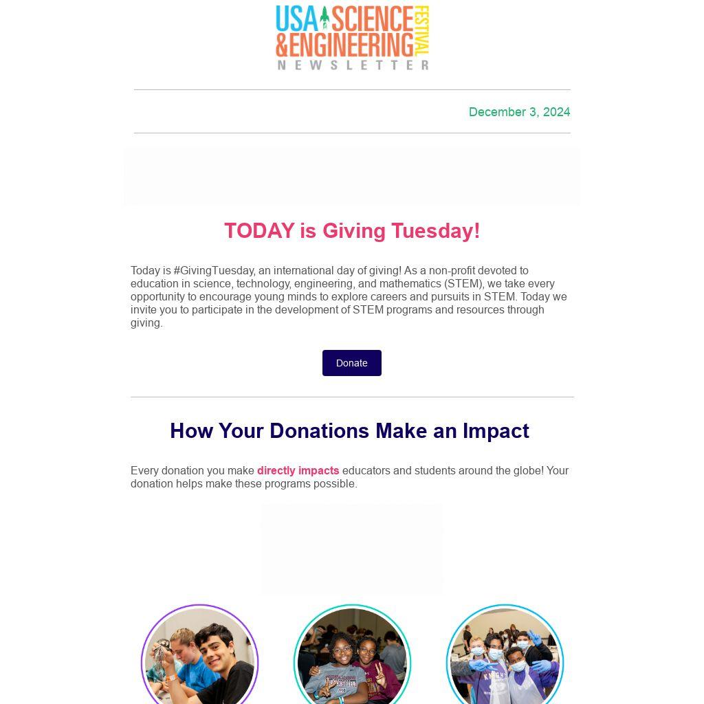 Today is #GivingTuesday, an international day of giving! As a non-profit devoted to education in science, technology, engineering, and mathematics (STEM), we take every opportunity to encourage young minds to explore careers and pursuits in STEM. Today we invite you to participate in the development of STEM programs and resources through giving.