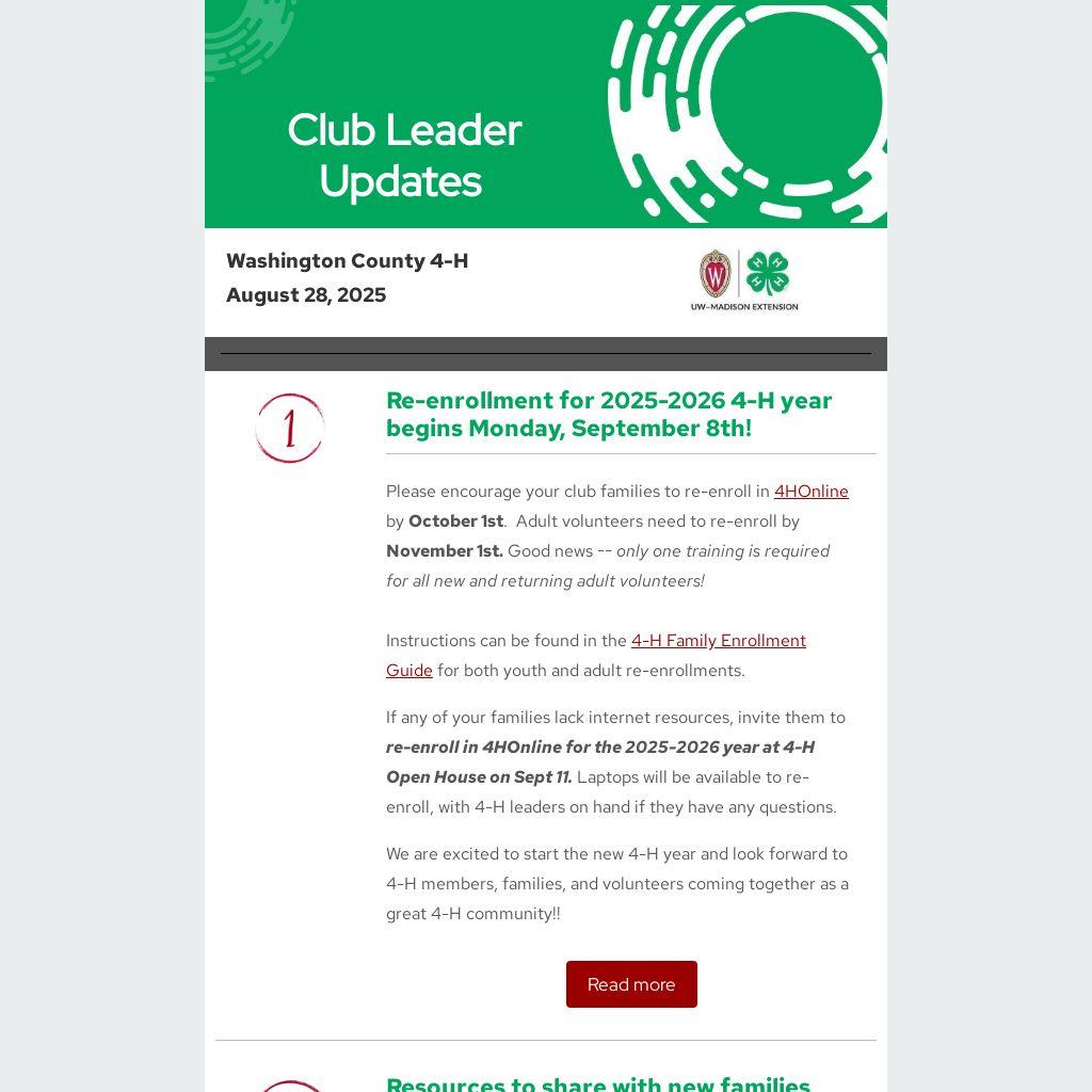 If any of your families lack internet resources, invite them to re-enroll in 4HOnline for the 2025-2026 year at 4-H Open House on Sept 11. Laptops will be available to re-enroll, with 4-H leaders on hand if they have any questions.